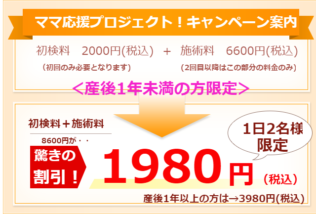 ※産後の骨盤整体の必要性を多くの方に分かってほしいという理念のための破格設定になっています。
